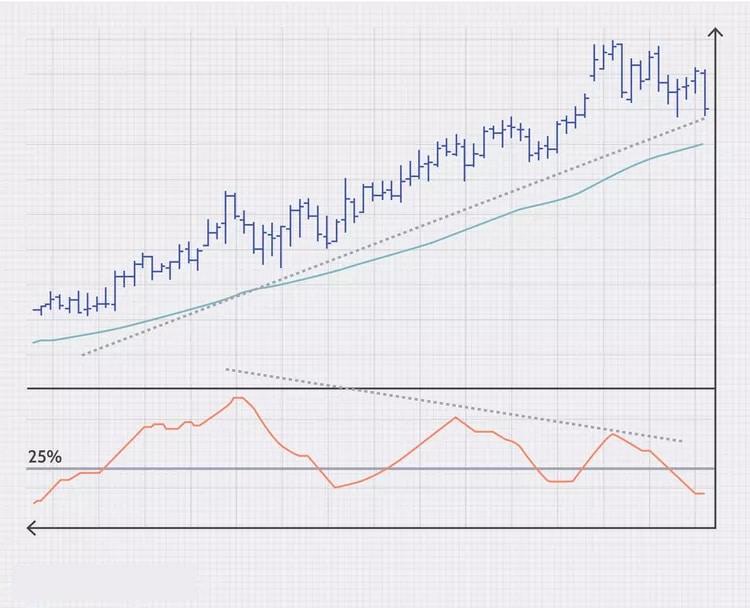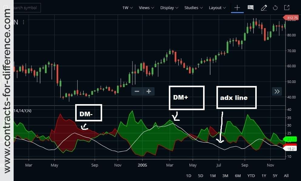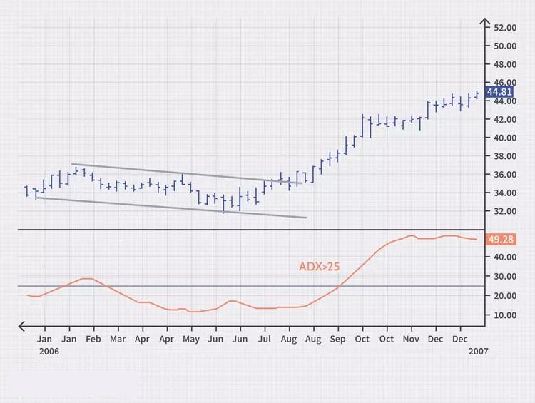 The image illustrates this concept: as the ADX line rises above 25, the trend is strengthening. When the line peaks and starts to fall, it shows that the trend is losing strength, but this does not automatically signal a reversal unless accompanied by other factors, such as a price climax. The key takeaway is that the direction of the ADX line reveals changes in momentum, not necessarily in trend direction. A falling ADX above 25 indicates that the trend is still in place, albeit with less force. Conversely, when the ADX drops below 25, the trend is considered weak or non-existent.