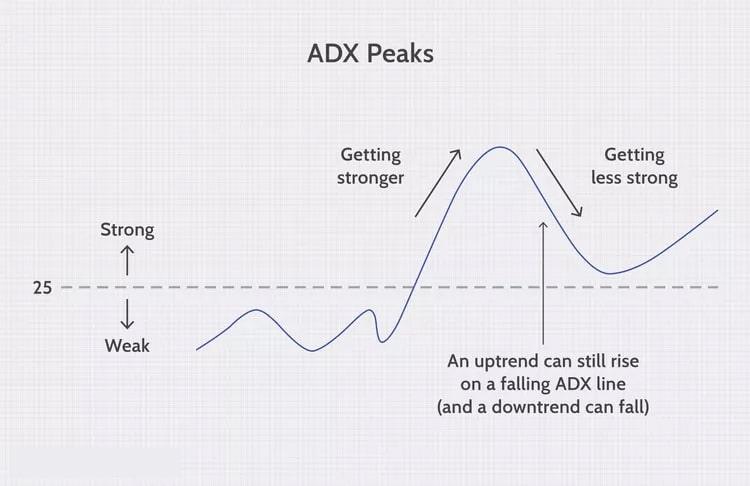This visual representation is illustrated in the image where ADX peaks are all above 25 but progressively smaller, reflecting the fact that while the trend is losing momentum, it hasn’t reversed yet.