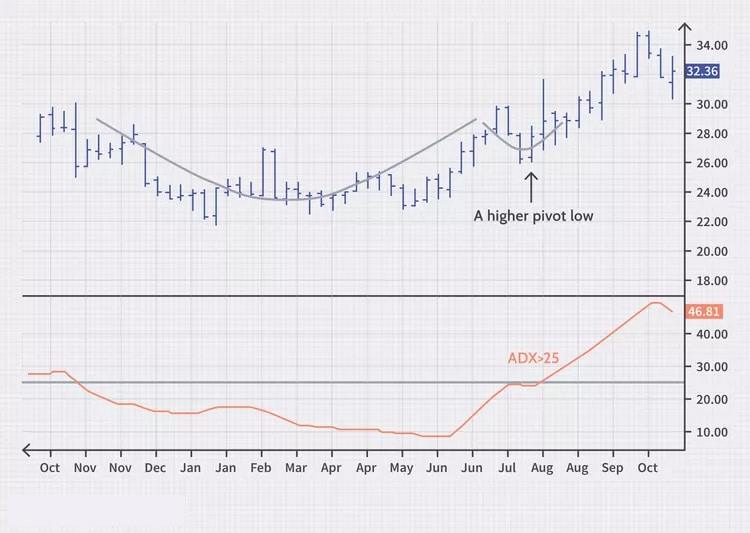 When ADX peaks are progressively higher, this indicates that trend momentum is increasing, giving traders the confidence to stay in the trade and let their profits run. Even if price remains in an uptrend while ADX peaks decline, the message is that while momentum may be fading, the uptrend remains intact. This occurs because overhead supply is gradually consumed as the trend progresses, leading to smaller, but still upward, price movements. In these situations, even a lower ADX peak above 25 still signals a strong trend, but the trader should be aware that momentum is weakening.