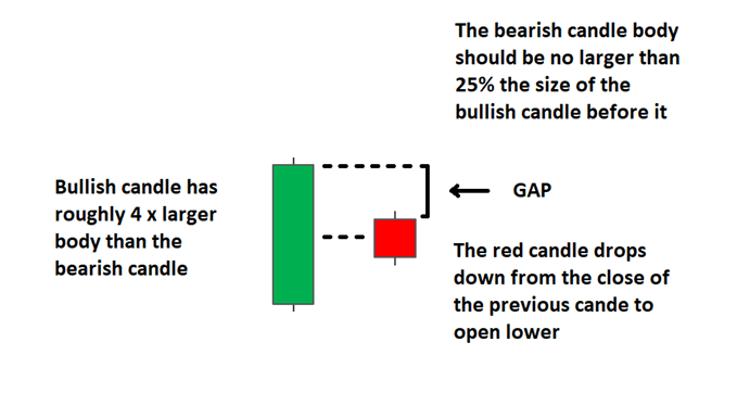 3. Check the size of the small red candle: Ensure that the body of the small red candle is no more than 25% of the length of the previous bullish candle. In stock charts, you’ll often see a gap down, with the red candle appearing midway down the previous candle. In forex charts, the candles usually open at the same level as the prior candle’s close or very close to it, so gaps are less common.