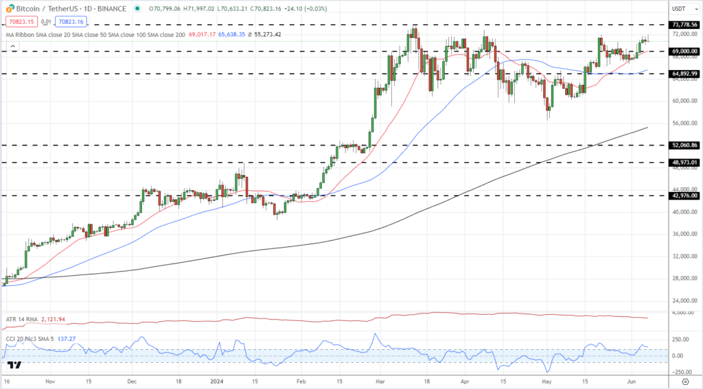 The world’s premier cryptocurrency, Bitcoin, is currently finding it challenging to break above the critical resistance level of $72,000. However, the digital asset remains firmly entrenched in a positive long-term trend.