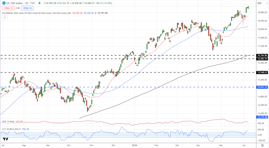 The Nasdaq 100 index is currently posting a fresh record high, driven primarily by the remarkable performance of the world’s second-largest company, Nvidia. The AI chip giant has recently overtaken Apple in terms of market capitalization and is now nipping at the heels of Microsoft.