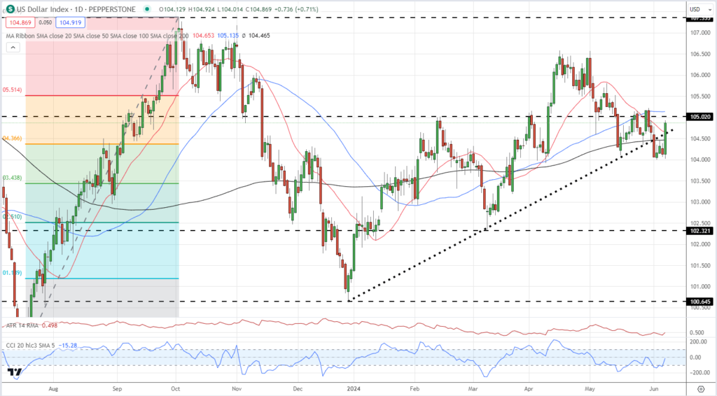 Despite the dollar’s rebound, the broader US dollar index remains in a downtrend. However, a move above the 105.21 level would break the recent series of higher lows and potentially signal a shift in the broader trend.