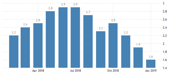 To illustrate, a chart of US inflation rates in 2018/19 shows that for the latest month, expectations are set at 1.6% inflation compared to the prior year’s data. If the actual CPI figure deviates from these expectations, it can influence the market.