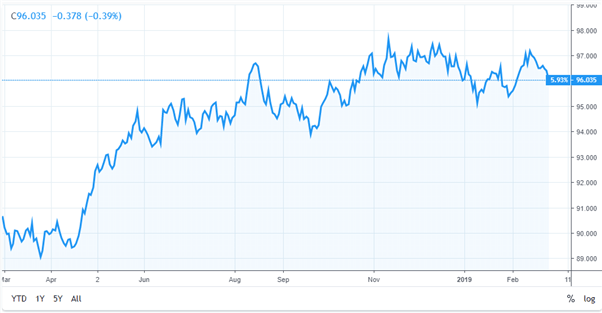 The example illustrates that as inflation rose in the first half of 2018, the US Dollar Index correspondingly increased. However, as US inflation drifted lower in subsequent months and missed the 2% target, it pushed US interest rate hikes off the agenda, causing the dollar to struggle and weaken against other currencies.