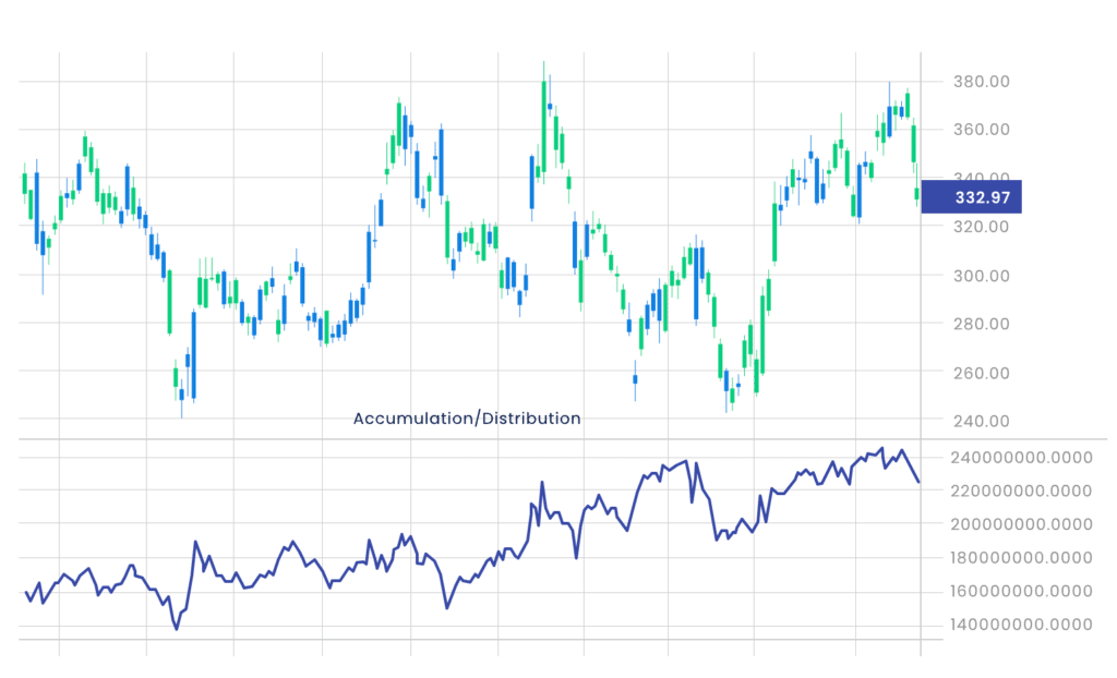 The Accumulation/ Distribution (A/D) indicator is a volume-based tool used to identify whether a currency pair is being accumulated (bought) or distributed (sold) in the market. It measures the flow of money into and out of the currency pair, offering insights into buying or selling pressure.