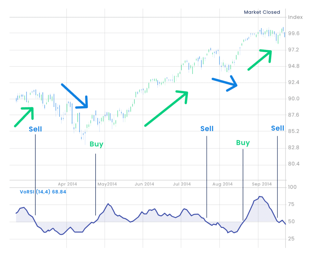 - When the Volume RSI provides a reading above 50%, it indicates that the market is bullish, signaling traders to go long.
