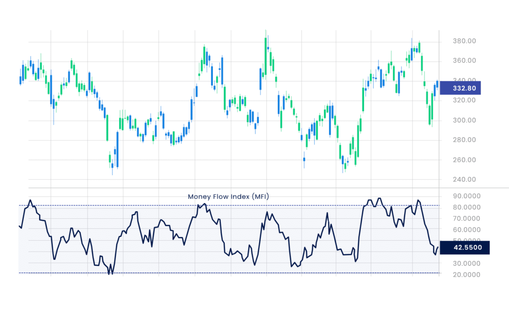 The Money Flow Index (MFI) is a volume-based indicator that identifies overbought and oversold market conditions over a given time period. The MFI ranges from 0 to 100, and it provides signals for potential market reversals.