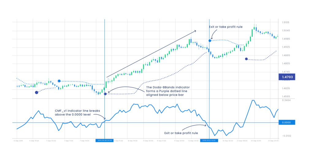 - A positive CMF value combined with a currency pair making a new high price and breaking through resistance confirms a bullish continuation, signaling traders to go long.